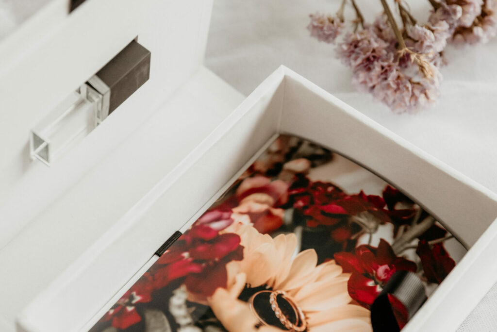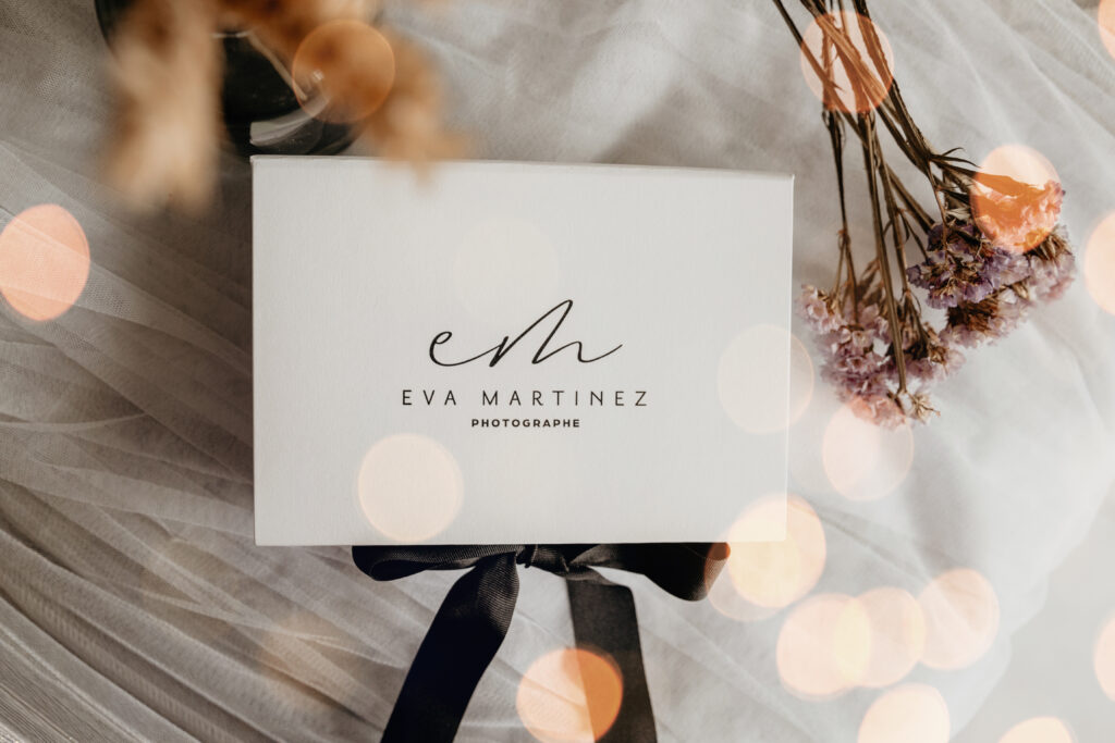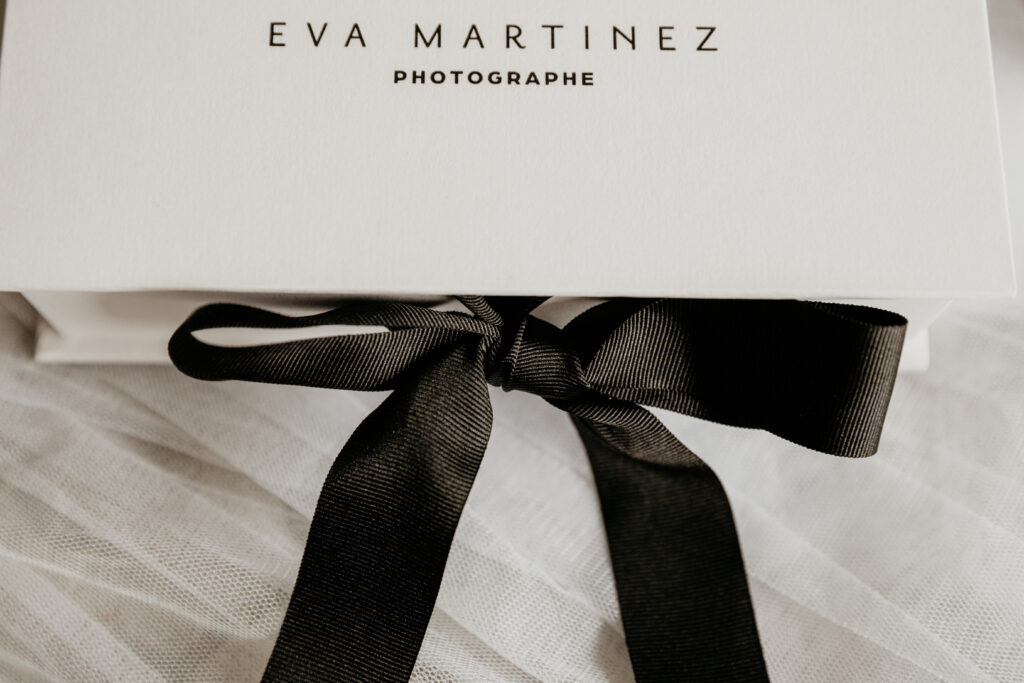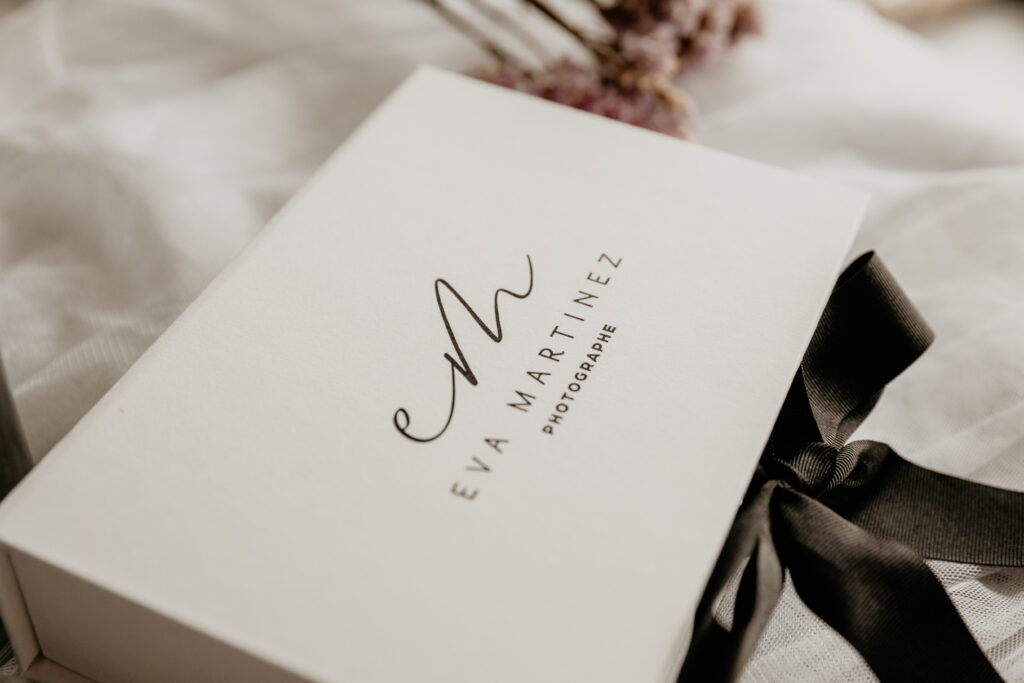 Coffret blanc avec ruban noir, clé USB noire.